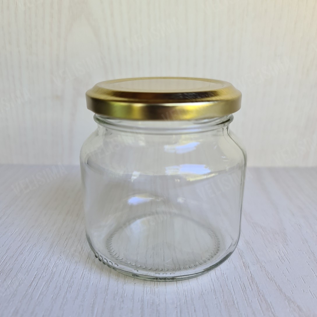 Envase de vidrio con tapa de metal dorada a rosca; sus medidas aproximadas son de 8cm de alto x 7cm de ancho, y tiene una capacidad de 220grs. Ideal para la elaboracion de velas de cera de soja.