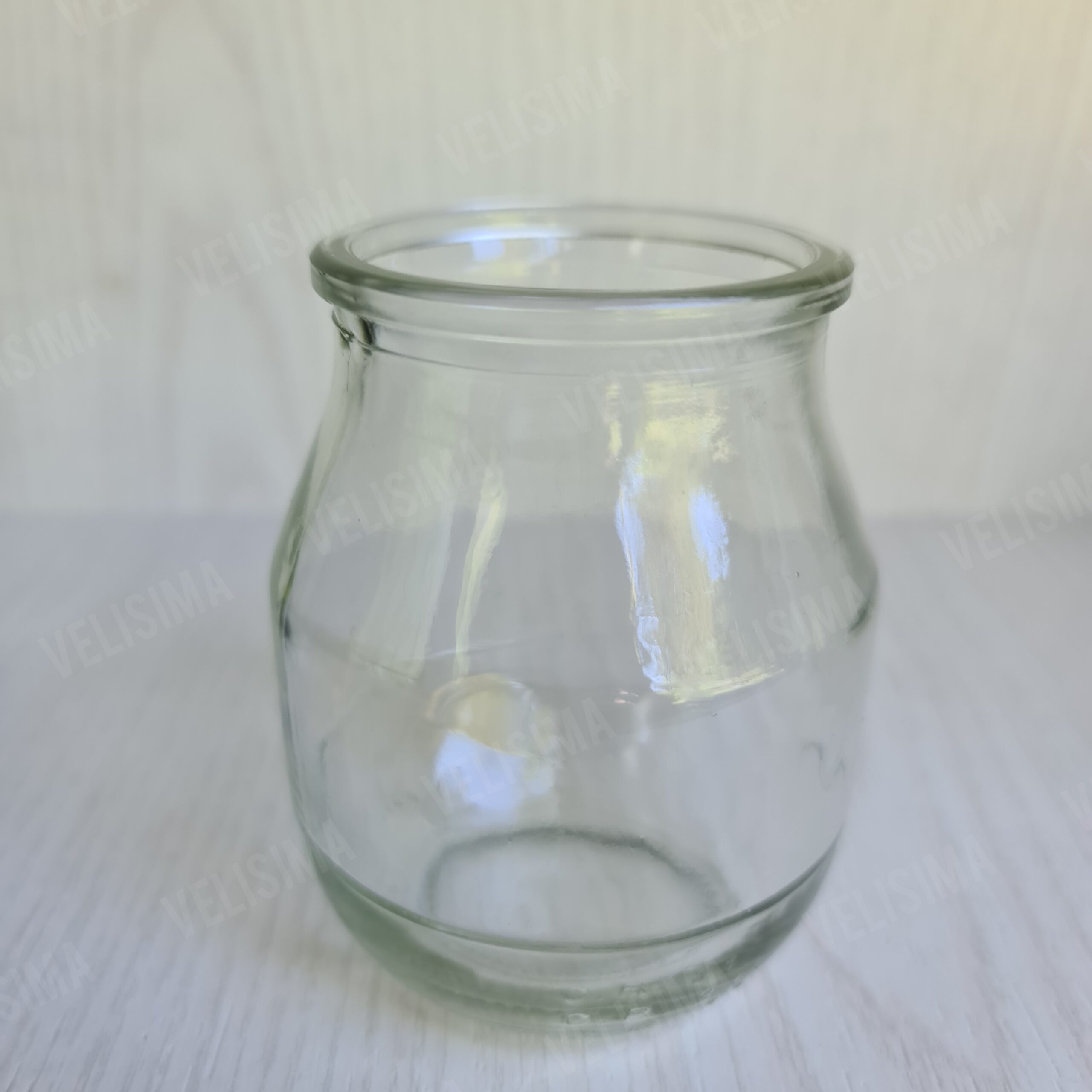 Envase de vidrio; sus medidas aproximadas son de 8,5cm de alto x 7cm de ancho, y tiene una capacidad de 200grs. Ideal para la elaboracion de velas de cera de soja.