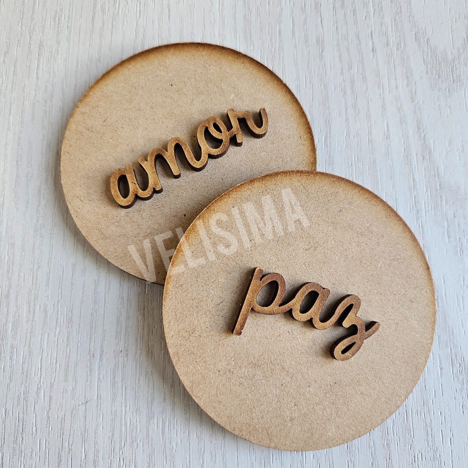 Tapas de madera fibrofacil con frase superpuesta en «AMOR / PAZ» ideales para los envases tennesse. El precio es por unidad